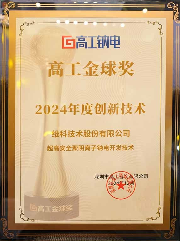 12月12日,由高工鈉電、高工產(chǎn)業(yè)研究院(GGII)主辦的2024高工鈉電年會(huì)暨高工金球獎(jiǎng)?lì)C獎(jiǎng)典禮在深圳召開(kāi)。維科技術(shù)憑借“超高安全聚陰離子鈉電開(kāi)發(fā)技術(shù)”,成功斬獲“2024年度創(chuàng)新技術(shù)”獎(jiǎng)項(xiàng)。此項(xiàng)殊榮標(biāo)志著維科技術(shù)在鈉電領(lǐng)域的技術(shù)創(chuàng)新、量產(chǎn)規(guī)模、市場(chǎng)應(yīng)用等方面獲行業(yè)內(nèi)外高度認(rèn)可,更是作為“鈉電行業(yè)領(lǐng)軍企業(yè)”在推動(dòng)產(chǎn)業(yè)化發(fā)展和新技術(shù)突破的重要體現(xiàn)。