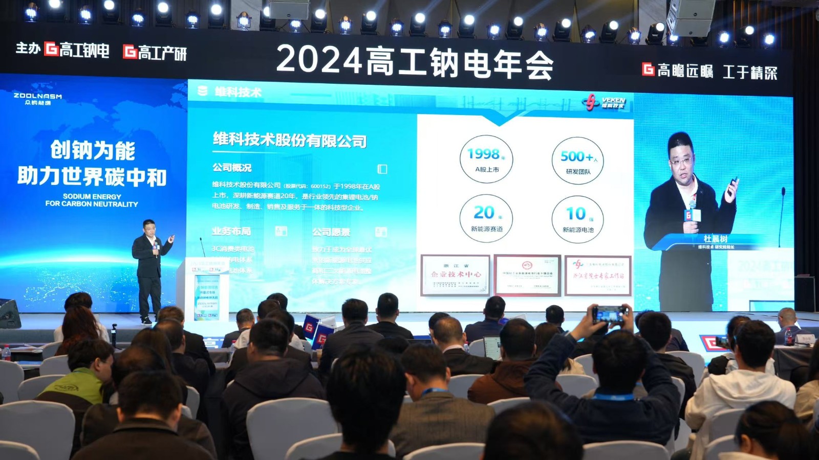 12月12日,以“守正謀變 破卷圖強(qiáng)”為主題的2024高工鈉電年會(huì)在深圳盛大開幕。作為本次活動(dòng)的專場贊助企業(yè),維科技術(shù)攜領(lǐng)先技術(shù)與創(chuàng)新成果應(yīng)邀參與此次行業(yè)盛會(huì)。維科技術(shù)研究院院長杜晨樹發(fā)表專題演講《維科技術(shù)鈉電池開發(fā)與應(yīng)用場景介紹》,深度剖析了鈉電在儲(chǔ)能領(lǐng)域的發(fā)展?jié)摿εc戰(zhàn)略意義。