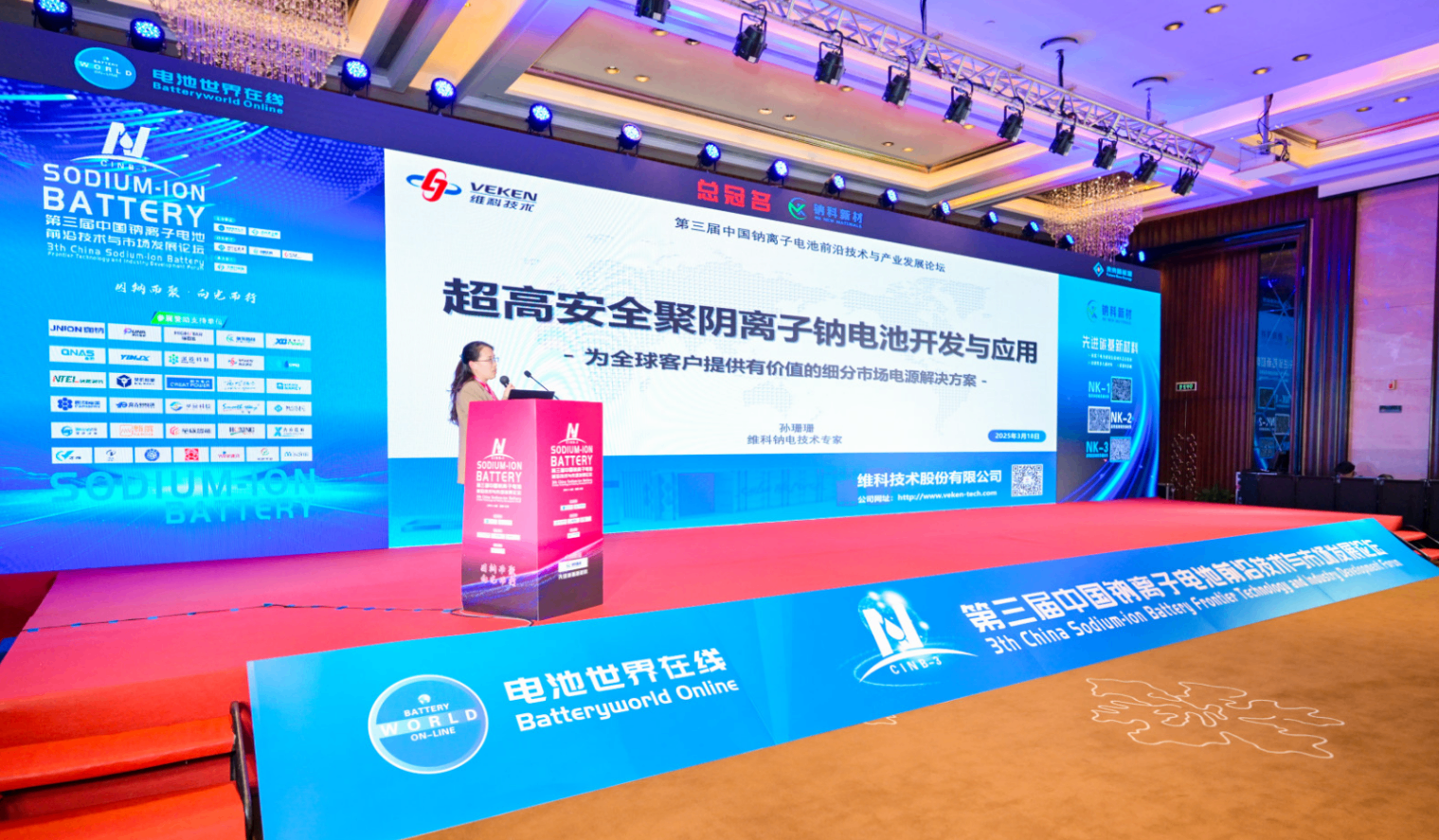 2025年3月17日-19日,由電池世界在線舉辦的“第三屆中國鈉離子電池前沿技術(shù)與產(chǎn)業(yè)發(fā)展論壇”在長沙隆重舉行,旨在搭建開放、共享的行業(yè)交流平臺,推動鈉離子電池技術(shù)創(chuàng)新與產(chǎn)業(yè)化進程。作為新能源鈉電領(lǐng)域的領(lǐng)軍企業(yè)之一,維科技術(shù)受邀參會并進行維科鈉電技術(shù)分享,深度解析維科鈉電技術(shù)開發(fā)的最新成果及多場景應(yīng)用實踐,獲得行業(yè)與市場高度關(guān)注。